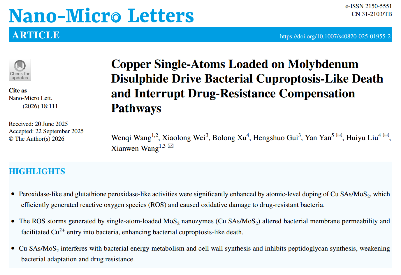 近日,安徽医科大学王咸文教授团队与北京化工大学刘惠玉教授和安徽工业大学闫岩教授合作,报道了一种通过溶液浸渍法合成的铜单原子负载二硫化钼纳米酶(Cu SAs/MoS₂),这种具有多种功能的纳米酶不仅可以有效杀死细菌,还可以减缓细菌耐药性的发展,以对抗耐药细菌感染。相关工作以Copper Single‑Atoms Loaded on Molybdenum Disulphide Drive Bacterial Cuproptosis-Like Death and Interrupt Drug-Resistance Compensation Pathways为题发表在著名期刊Nano-Micro Letters,期刊最新影响因子36.3。
