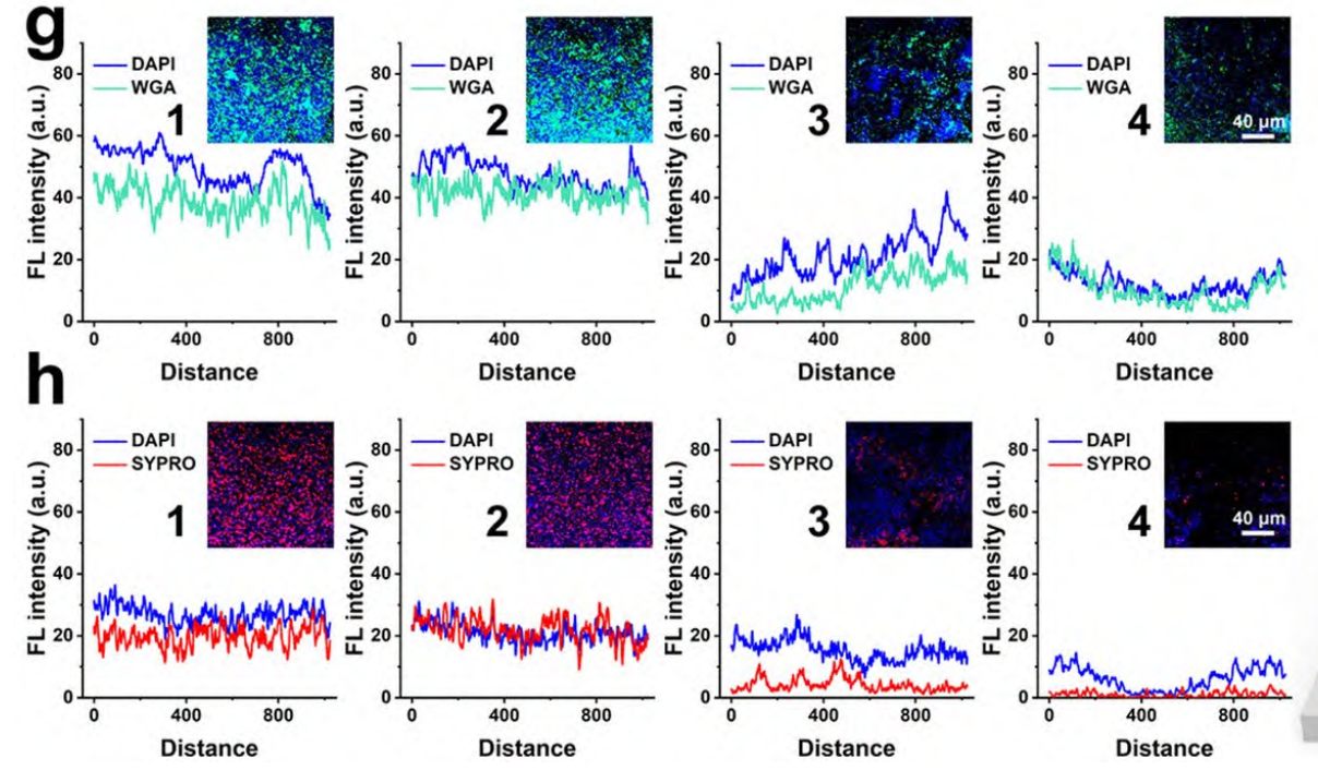 作者采用荧光定量分析技术来进一步证实Cu SAs/MoS₂对生物膜的破坏作用。生物膜破坏通常伴随着细胞外聚合物(PS)中的多聚糖(用麦胚凝聚素(WGA)染色)和蛋白质(用SYPRO染色)的释放,这是生物膜结构干扰和分解的迹象。在MoS₂和Cu SAs/MoS₂组中,生物膜的PS成分明显降解和释放,进一步证实了生物膜结构的破坏(图6 g,h)。特别是,Cu SA/MoS₂处理组表现出更大的PS释放,表明其生物膜破坏能力更强。。