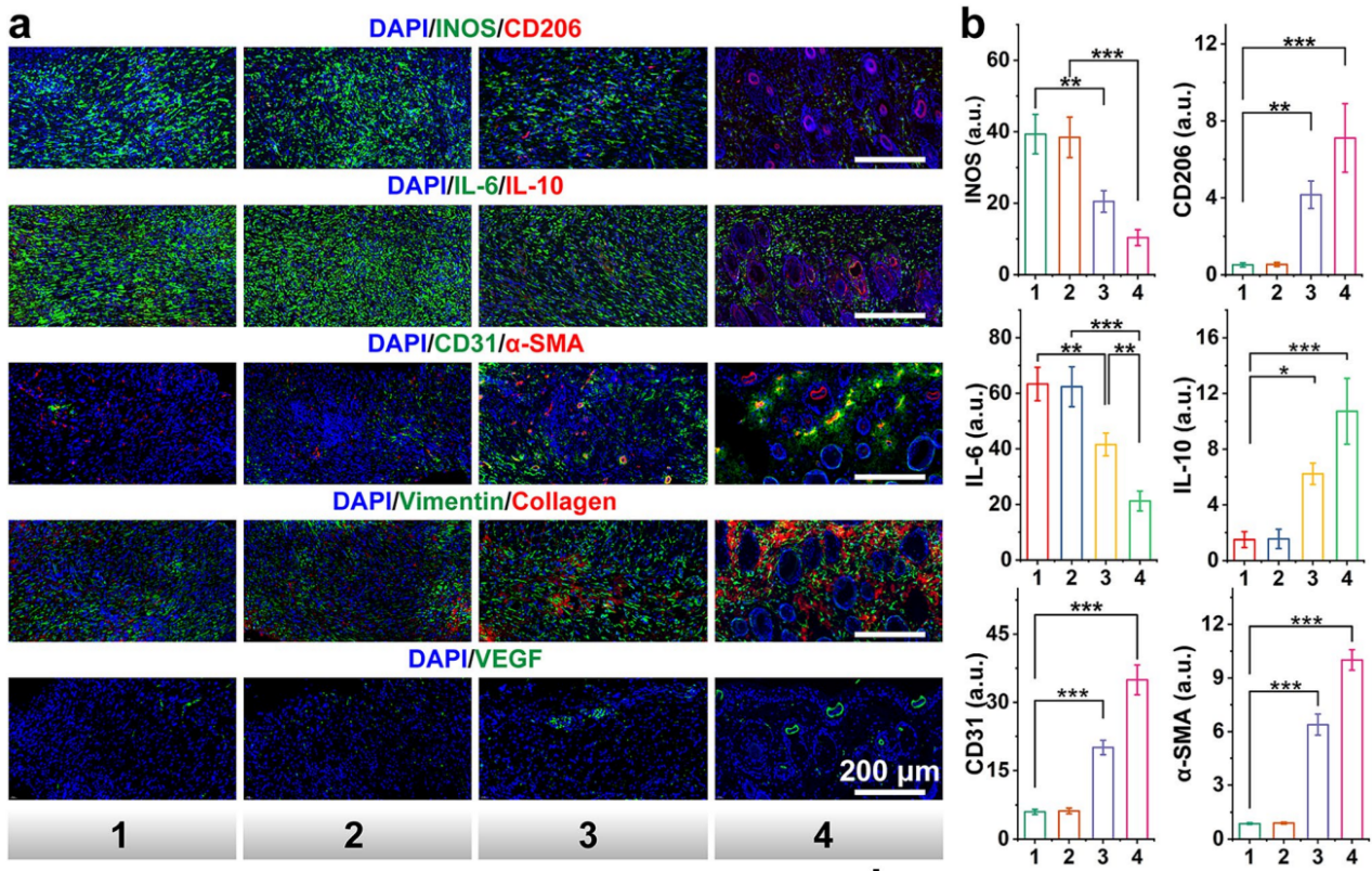 作者通过对实验动物组织的成像来进一步揭示Cu SAs/MoS₂的治疗能力。小鼠皮肤组织中生物标志物的荧光染色表明,用Cu SA/MoS₂处理有效减轻了皮肤组织中的炎症反应(降低了NOS和IL-6的水平),同时增强了抗炎和组织修复过程(增加了CD206和IL-10的水平)。这些发现表明巨噬细胞的极化从促炎M1型转变为抗炎和促进修复的M2型,从而促进炎症消退和组织愈合,证实了Cu SA/MoS₂在促进皮肤修复方面的积极作用。此外,CD31和血管内皮生长因子的表达升高反映了血管生成活性的增强。
