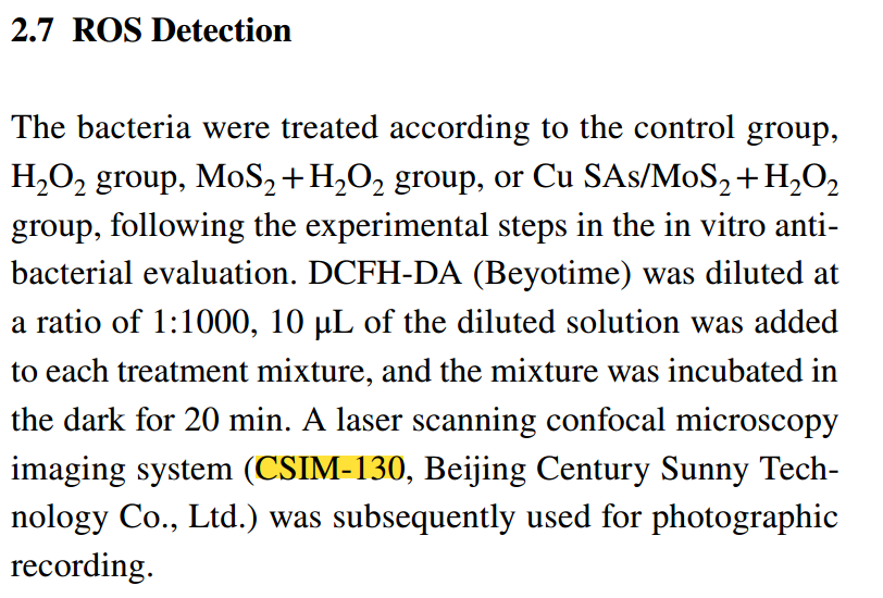 作者通过桑尼CSIM 130共聚焦系统观察Cu SAs/MoS₂对细菌生物膜形成的抑制情况和活性氧的产生情况,直观反映其抗菌能力的强弱。通过用PI染料标记活细菌并构建3D荧光生物膜图像,抑制和破坏组中的生物膜呈现出弱的绿色荧光和离散的形态,15μm厚生物膜的荧光定量分析显示,深层生物膜的荧光强度显著下降,表明生物膜受到严重破坏。随后,用DCFH-DA探针检测显示,用MoS₂和Cu SA/MoS₂处理的生物膜产生大量的活性氧,这是生物膜破坏的重要原因。